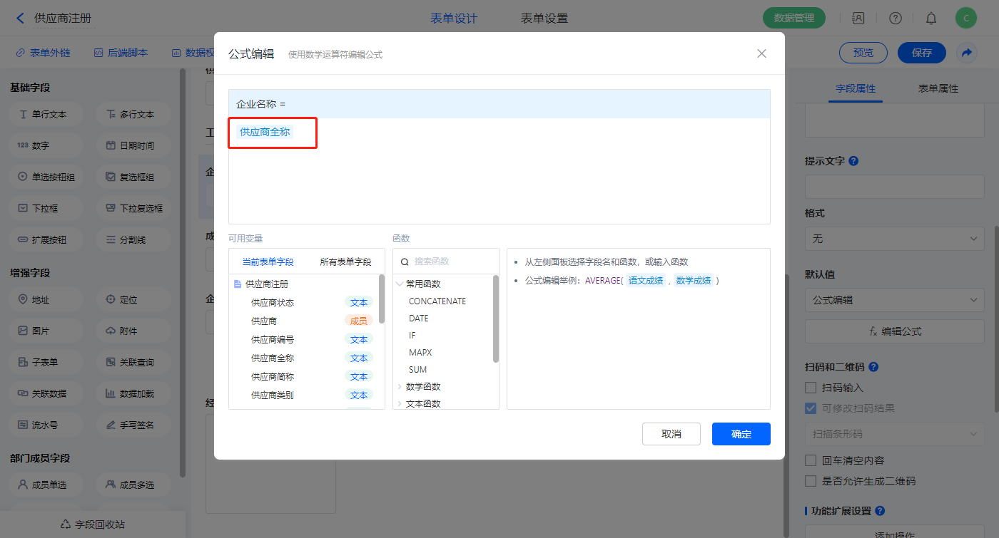 【企业名称】字段设置默认值为公式编辑,如图设置公式;