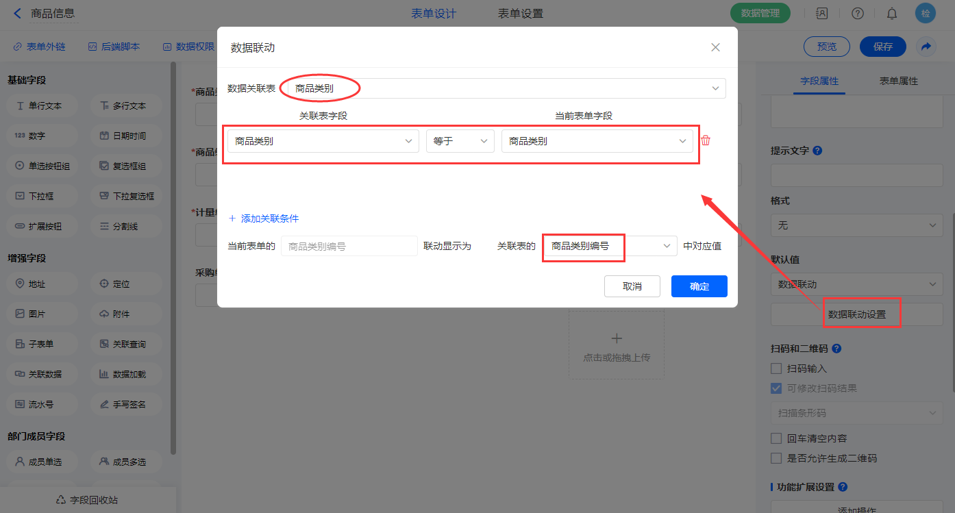 【商品类别名称】字段,设置默认值为数据联动,设置联动条件及联动字段;