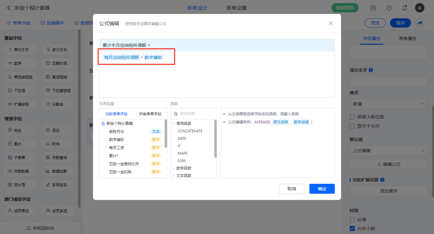 【本月需缴纳个税】字段,默认值选择公式编辑,如图设置公式;