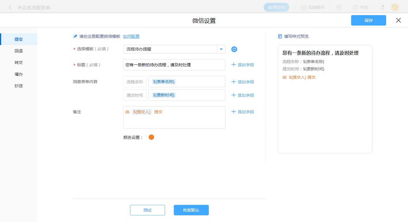 【流程设计】-【流程设定】-【流程属性】-【流程提醒】-【微信提醒,微信设置】