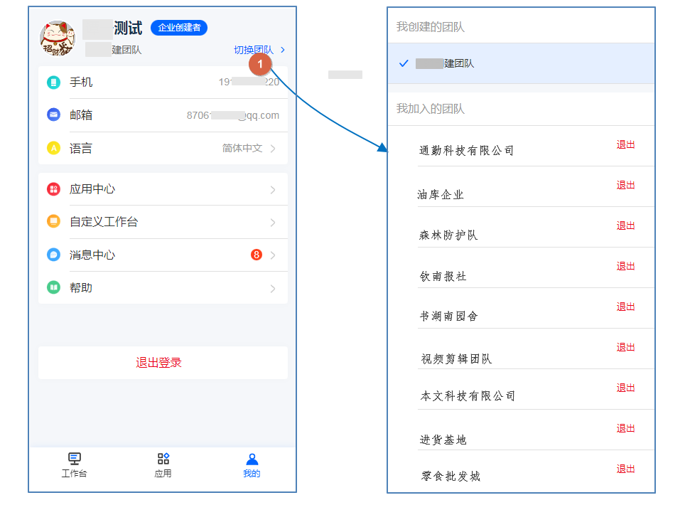 在个人中心可查看个人信息和团队信息,并且可以进行团队的切换。