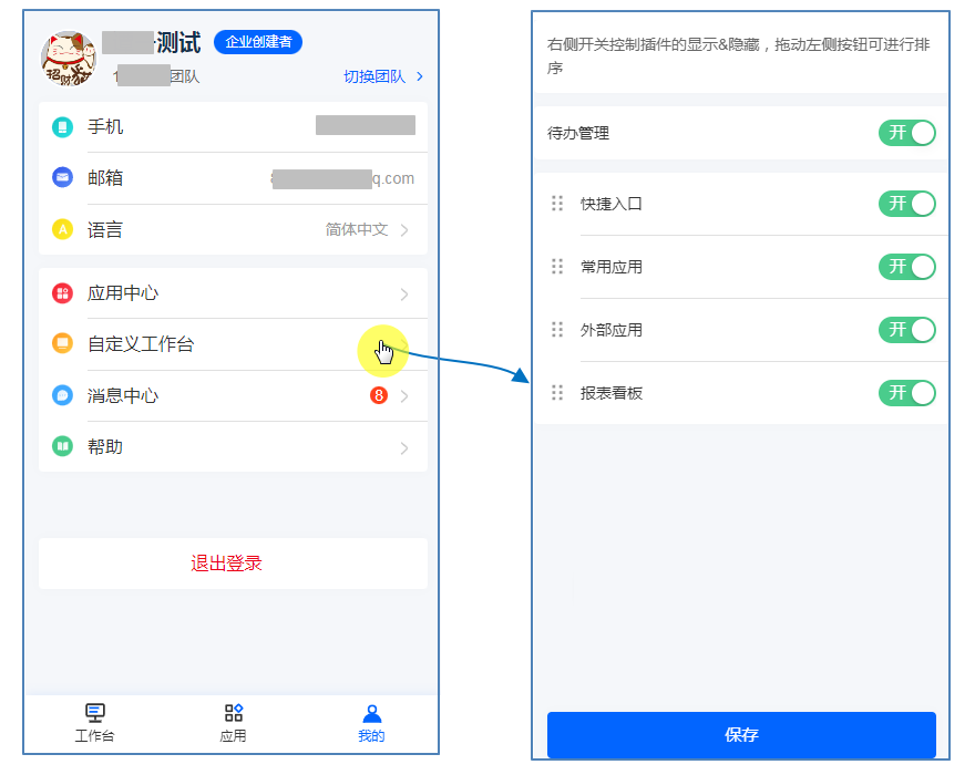 对于工作台内要展示的内容,还可以通过自定义工作台进行设置。