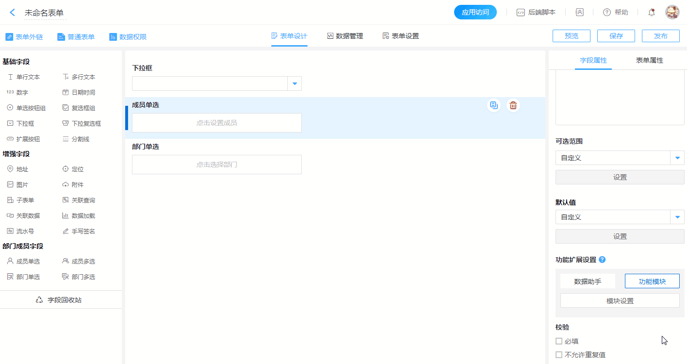 注意:表单外链不支持成员字段/部门字段,只有在系统数账号内访问表单,才可使用成员字段/部门字段。