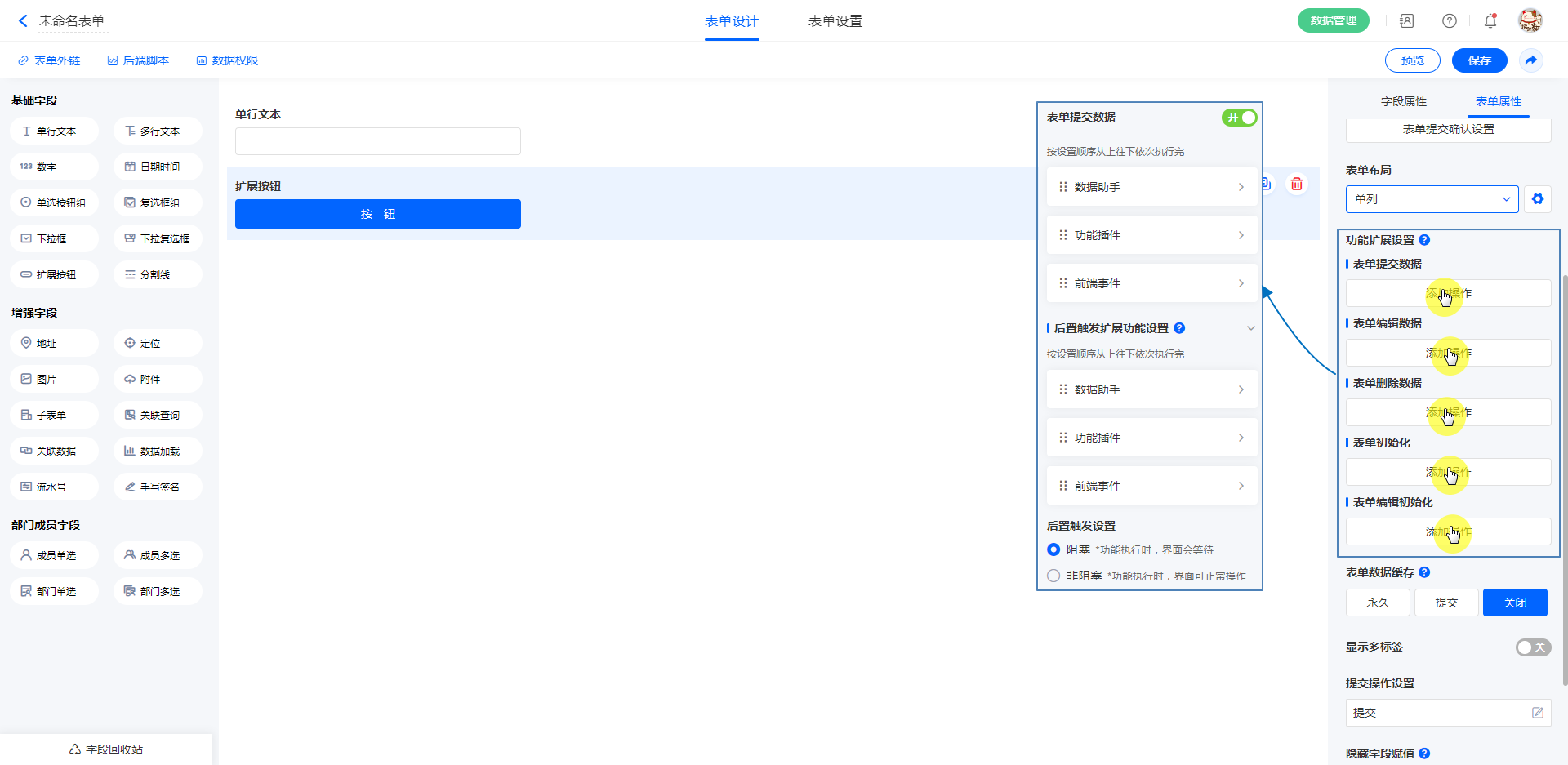这些位置均可根据不同的场景设置“功能插件”、“数据助手”、"前端事件"和“后端开发”(事件表单)。