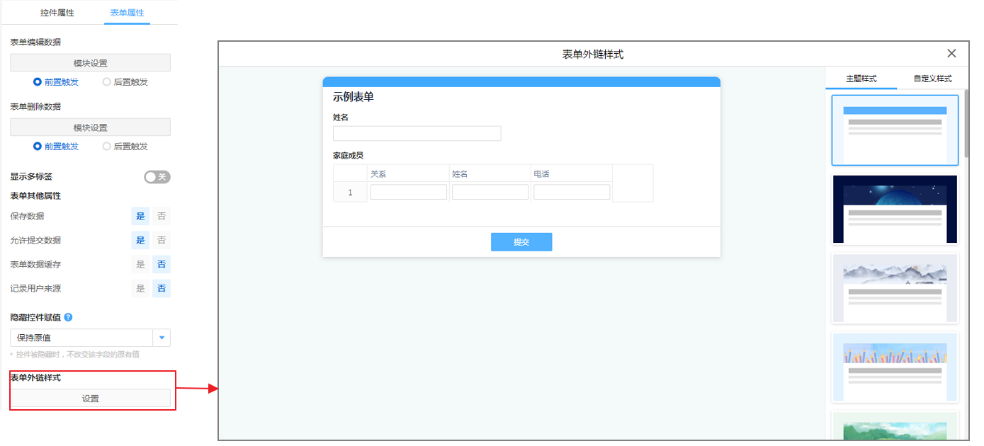 表单外链的样式分为主题样式和自定义样式,主题样式即云顶内置的样式模板我们选择就可使用。自定义样式即由自己自定义设置。