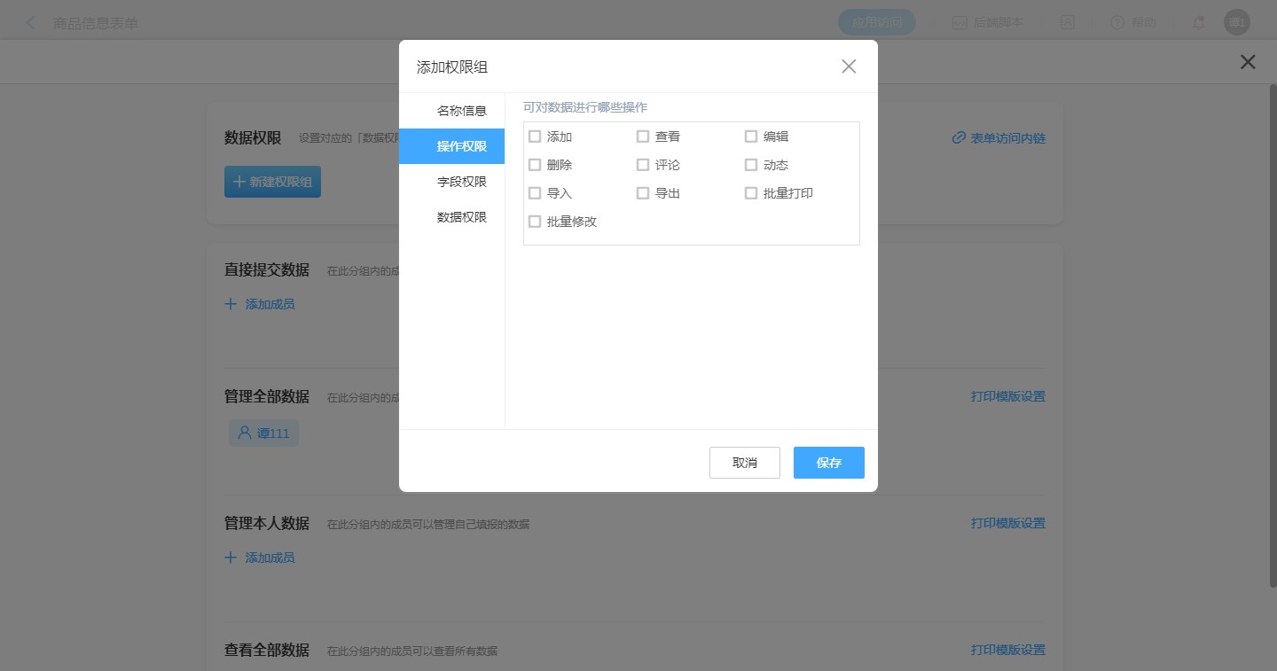表单类型 权限类型 权限组 操作权限 字段权限 数据权限(过滤条件) 权限范围
